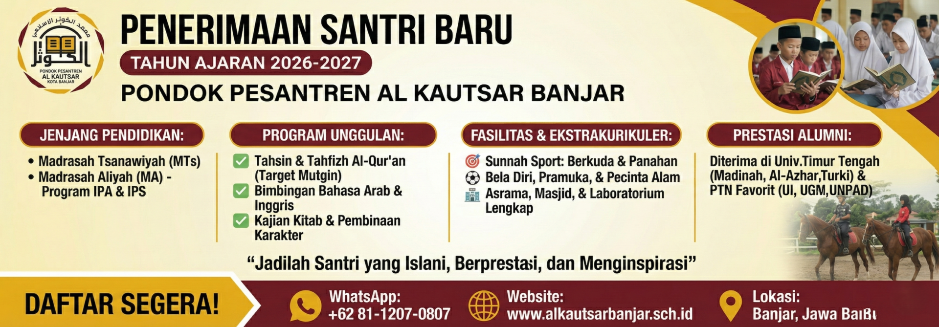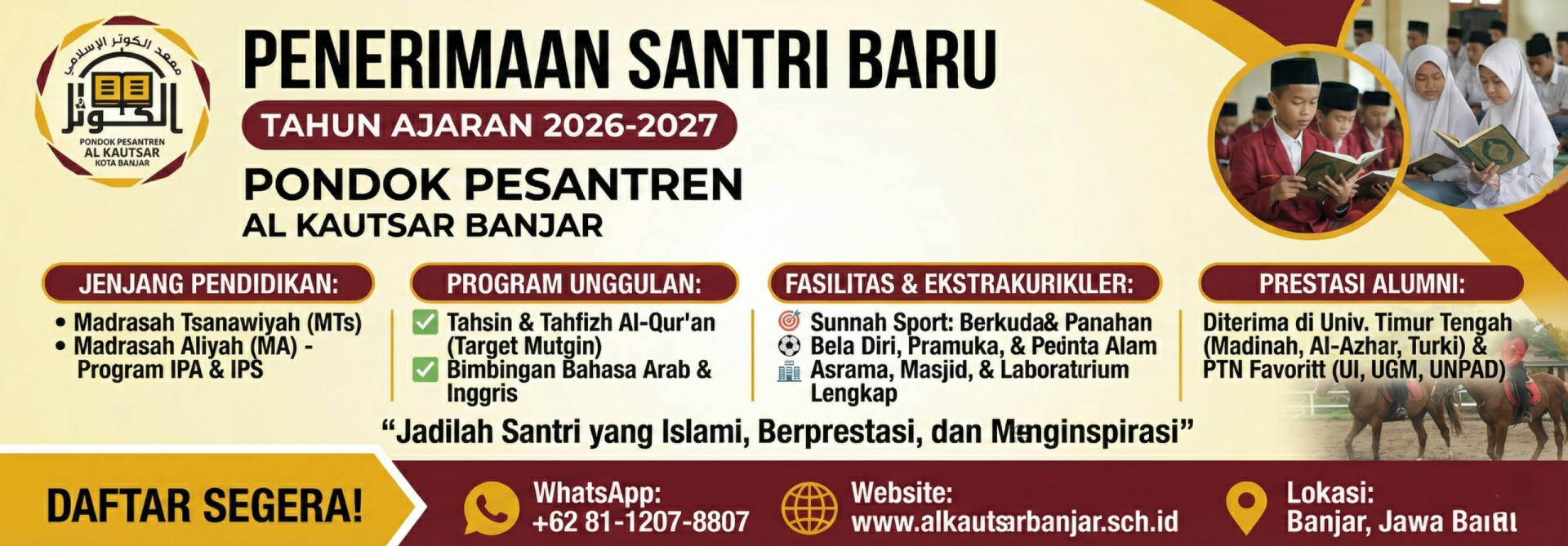 Berdiri di atas tanah wakaf sejak 1995, Al Kautsar Banjar memadukan kurikulum pesantren (Tahsin, Tahfizh, Bahasa Arab-Inggris) dengan pendidikan formal (MTs & MA). Kami berkomitmen melahirkan lulusan yang tidak hanya hafal Al-Qur’an, tetapi juga menguasai IPTEK dan siap bersaing di kancah global.